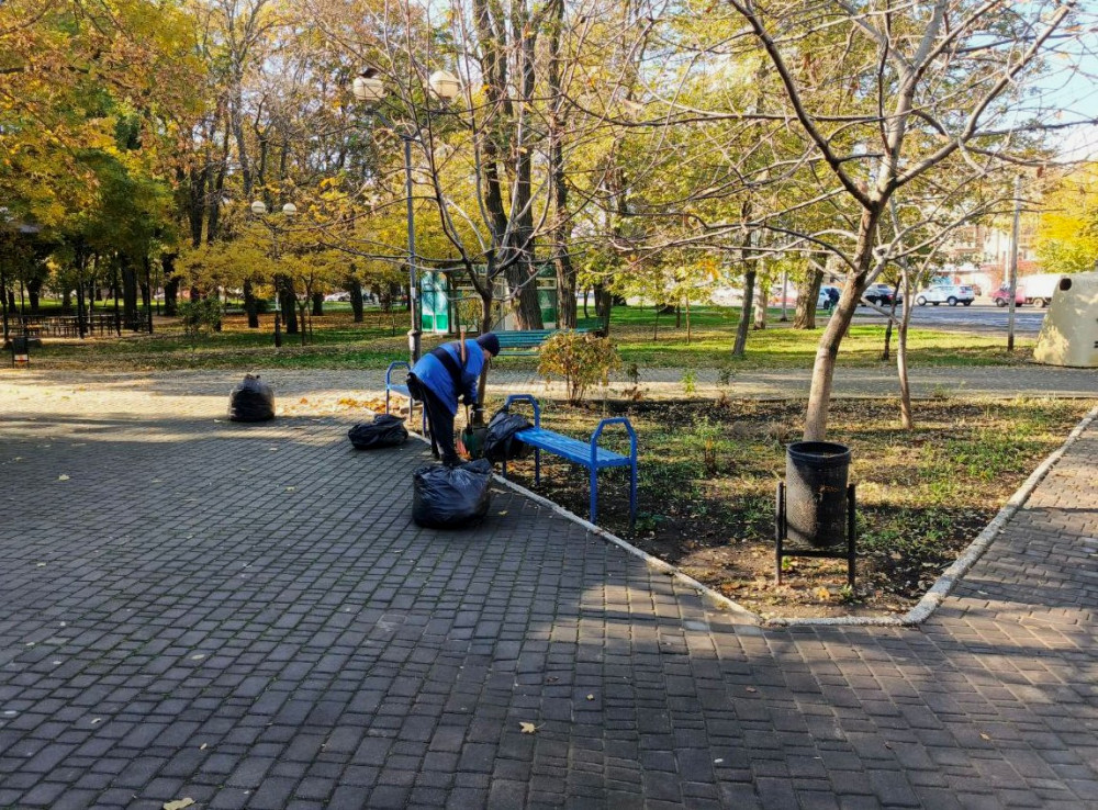 Additionally, as part of the beautification efforts, the utility workers painted benches, trash bins, and a portion of the facade of the well water station located at the corner of Krymsky Boulevard and Zabolotny Street.