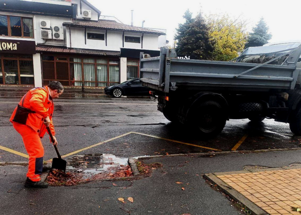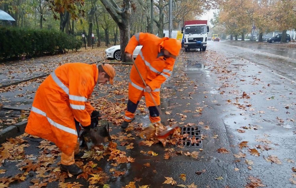 Workers are clearing the grates of stormwater drains from fallen leaves and debris carried by rainwater, ensuring efficient drainage from the city streets.