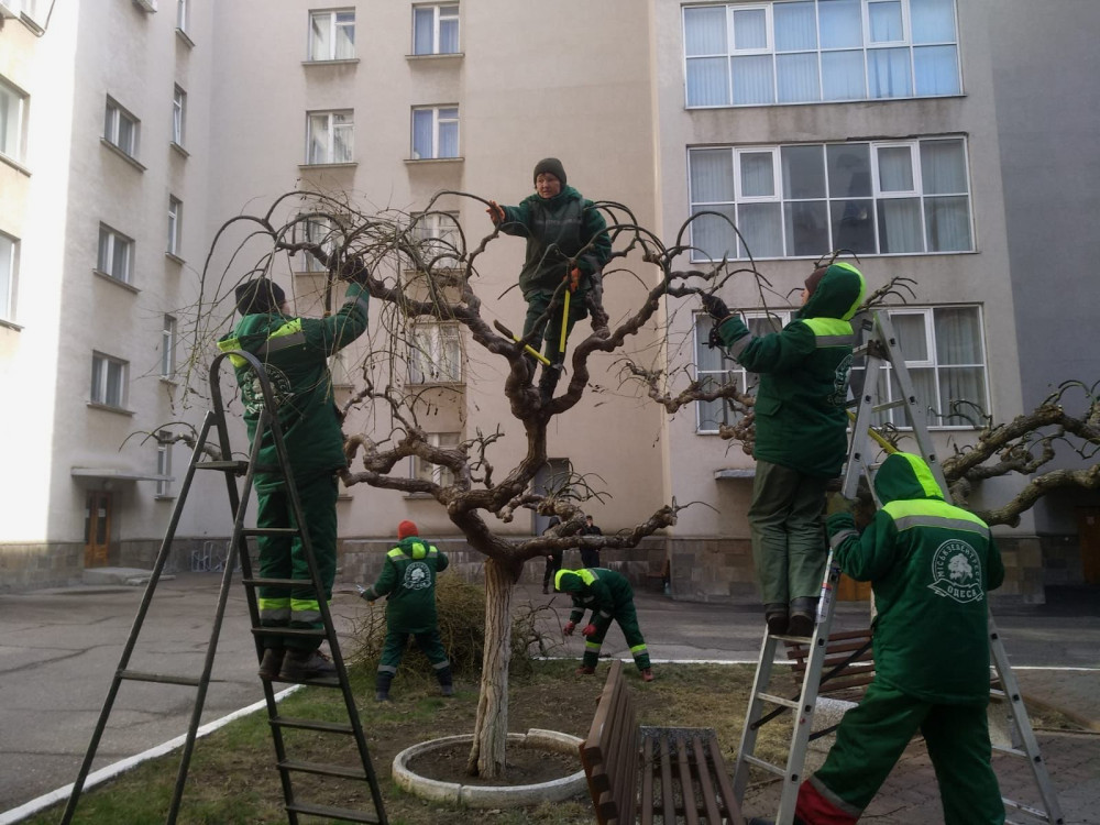 Traditionally, at the end of winter, just before the growth season begins, specialists from the Municipal Enterprise «Miskzelentrest» conduct formative pruning of grafted weeping trees, including Japanese sophora, mulberry, and ash trees. This is a necessary annual procedure for these types of trees.