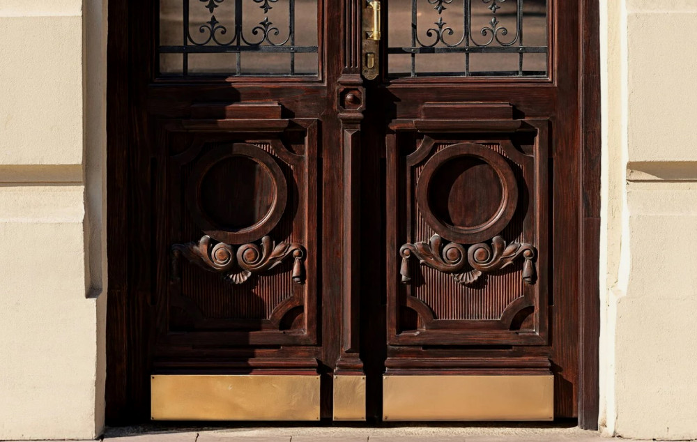 Thus, «Restoration of Doors in Odessa» recreated missing wooden decorative elements, restored wrought iron grates, and reproduced the lost transom bar. They returned the symmetry and proportions of the doors and also the authentic bolts and handles. To protect the lower part of the leaves, brass plates were installed to safeguard the wood from moisture and mechanical damage.