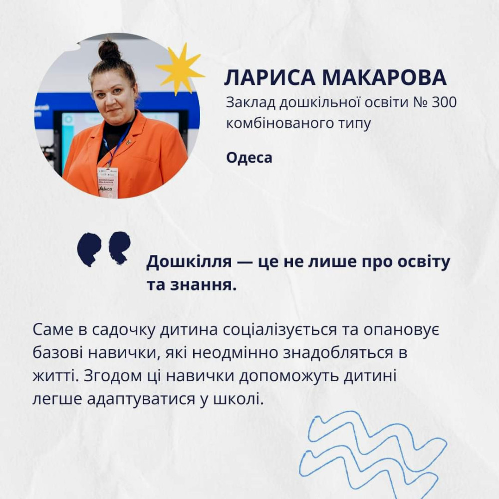 In 2024, the team led by Larisa Makarova received First Degree Diplomas at the city competition «Educational Pearl of Odessa» in the categories of «Gems of Preschool Education» and «Best Educational Practices for Creating a Modern Educational Environment» during the regional festival «Preschool - FEST».