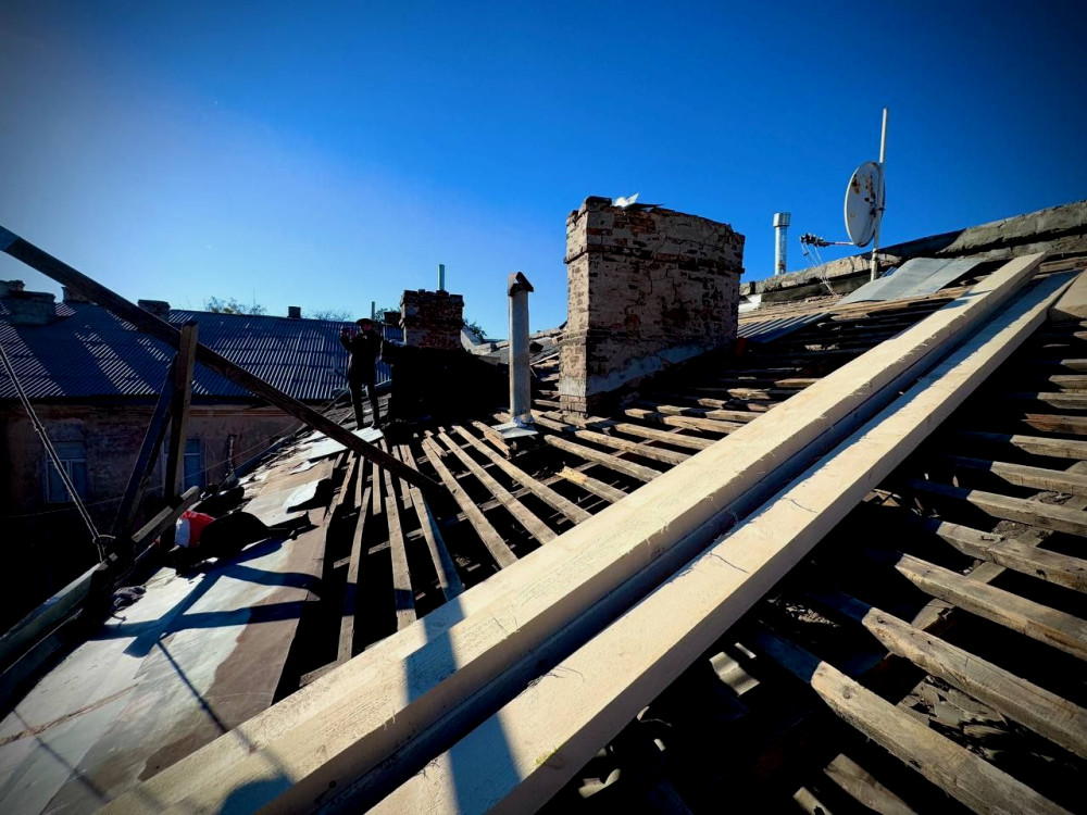 В настоящее время проводятся аварийные работы по восстановлению целостности кровли, кроме наиболее поврежденных участков, где верхние этажи почти разрушены.