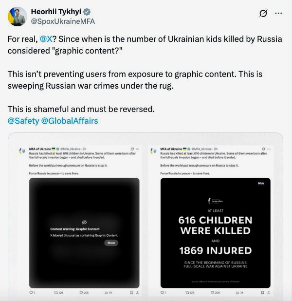 «Серьезно, X? С каких пор убийства украинских детей Россией считаются «шокирующим контентом”? Это не защита пользователей от жестоких материалов. Это - попытка скрыть военные преступления России. Это абсолютно недопустимо, и это решение должно быть отменено», - написал он в своей публикации.