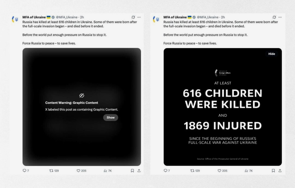 Георгий Тихий, представитель Министерства иностранных дел, выразил недовольство действиями соцсети X, которая пометила информацию о погибших украинских детях в результате российских атак как «шокирующий контент».