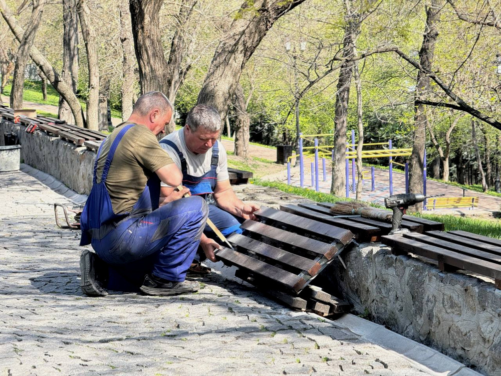 В парке имени Стамбула команда предприятия проводит ремонт и покраску скамеек и мусорных контейнеров. Также восстановлены информационные таблички на фонтане с питьевой водой.