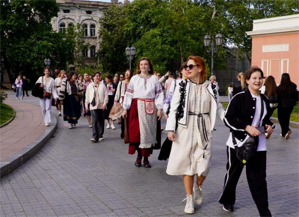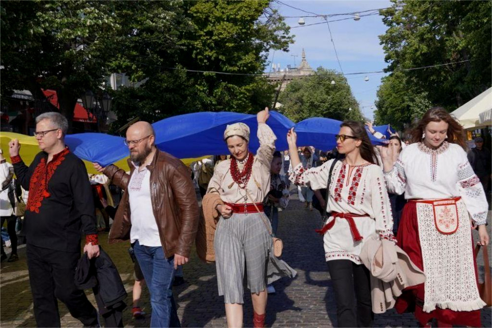 15 мая в Украине отмечается День вышиванки, и в Одессе около 50 человек прошли через центр города с большим украинским флагом. Во время шествия участники пели гимн и украинские песни. «Это мероприятие для нас – показатель нашей единства, мы все в вышиванках, мы все празднуем День вышиванки. Кроме того, во время шествия мы увидели много людей, гуляющих по улице в вышиванках», — рассказала организатор акции, глава этногруппы «Легит» Анна Панина.