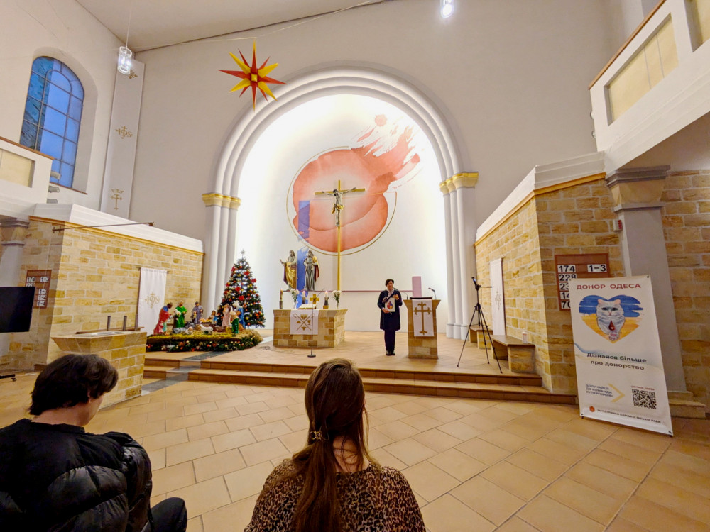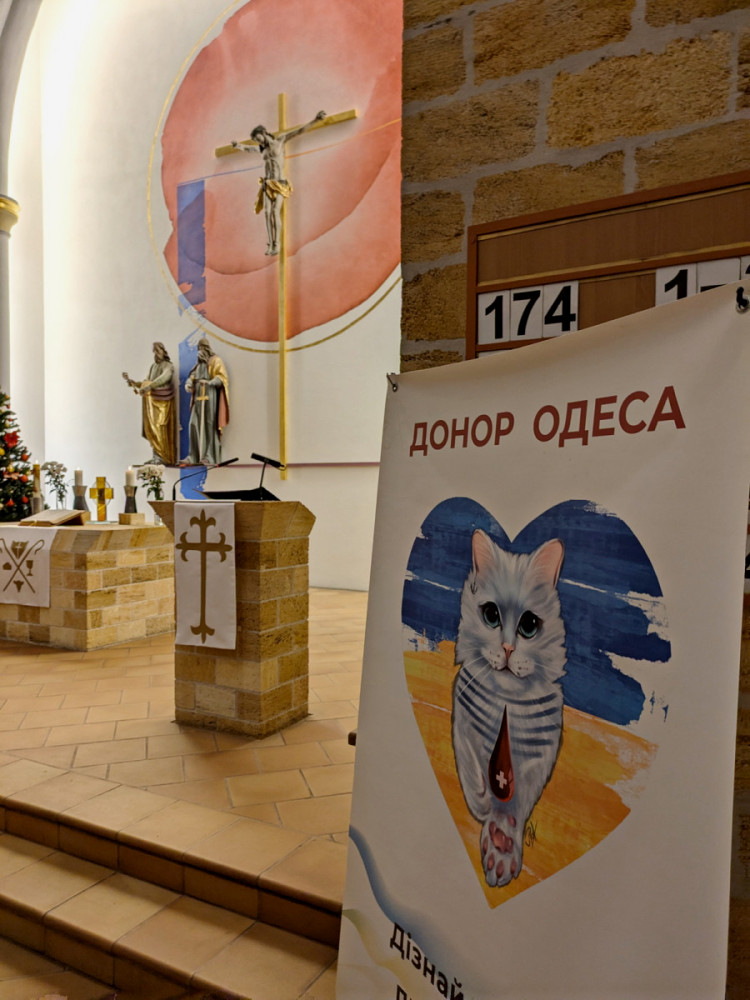 Символично, что над алтарем Одесской кирхи находится мурал с большой красной пятной, которая олицетворяет кровь Иисуса Христа, объединяющую всех, кто приходит к Божьему алтарю для причастия.