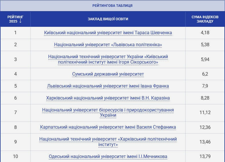 Согласно новому рейтингу украинских вузов «ТОП-200 Украина 2025», первое место занимает Киевский национальный университет имени Тараса Шевченко.