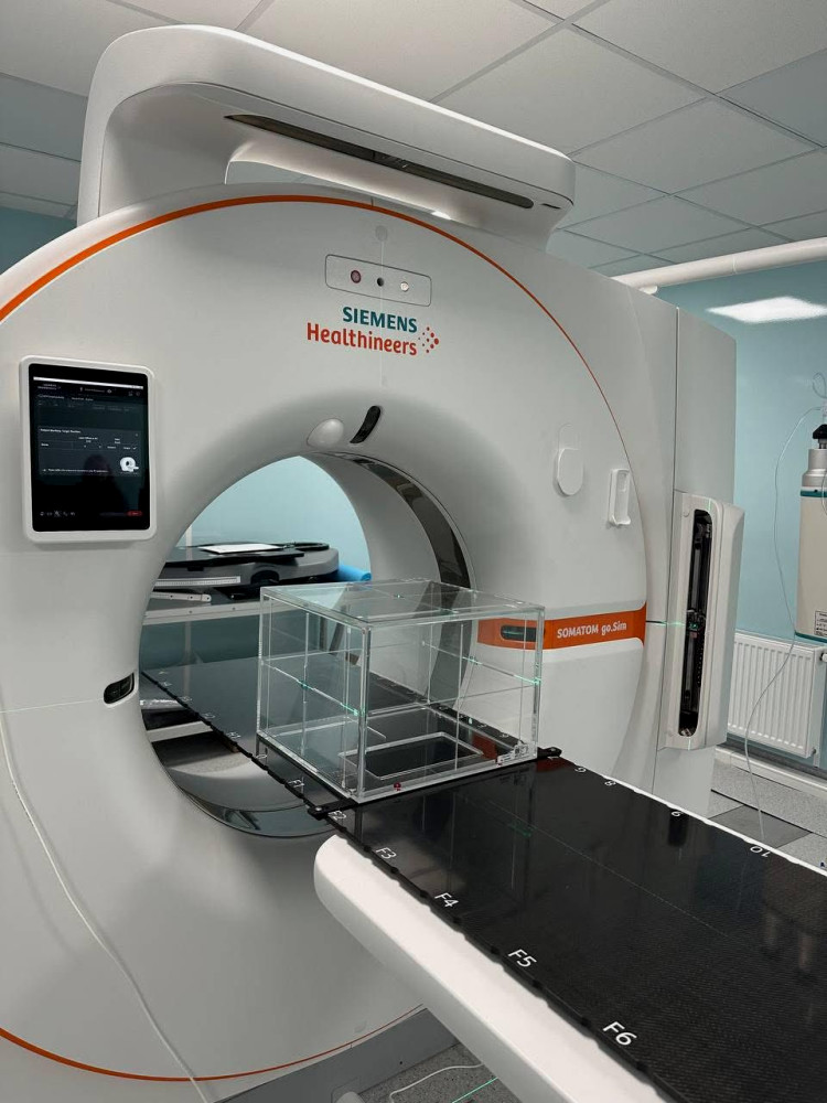 Специализированный аппарат SOMATOM go.Sim, который недавно был введен в эксплуатацию, работает совместно с линейным ускорителем Elekta Harmony, что позволяет точно планировать лучевую терапию. Данные, полученные во время обследования, автоматически передаются в систему облучения.